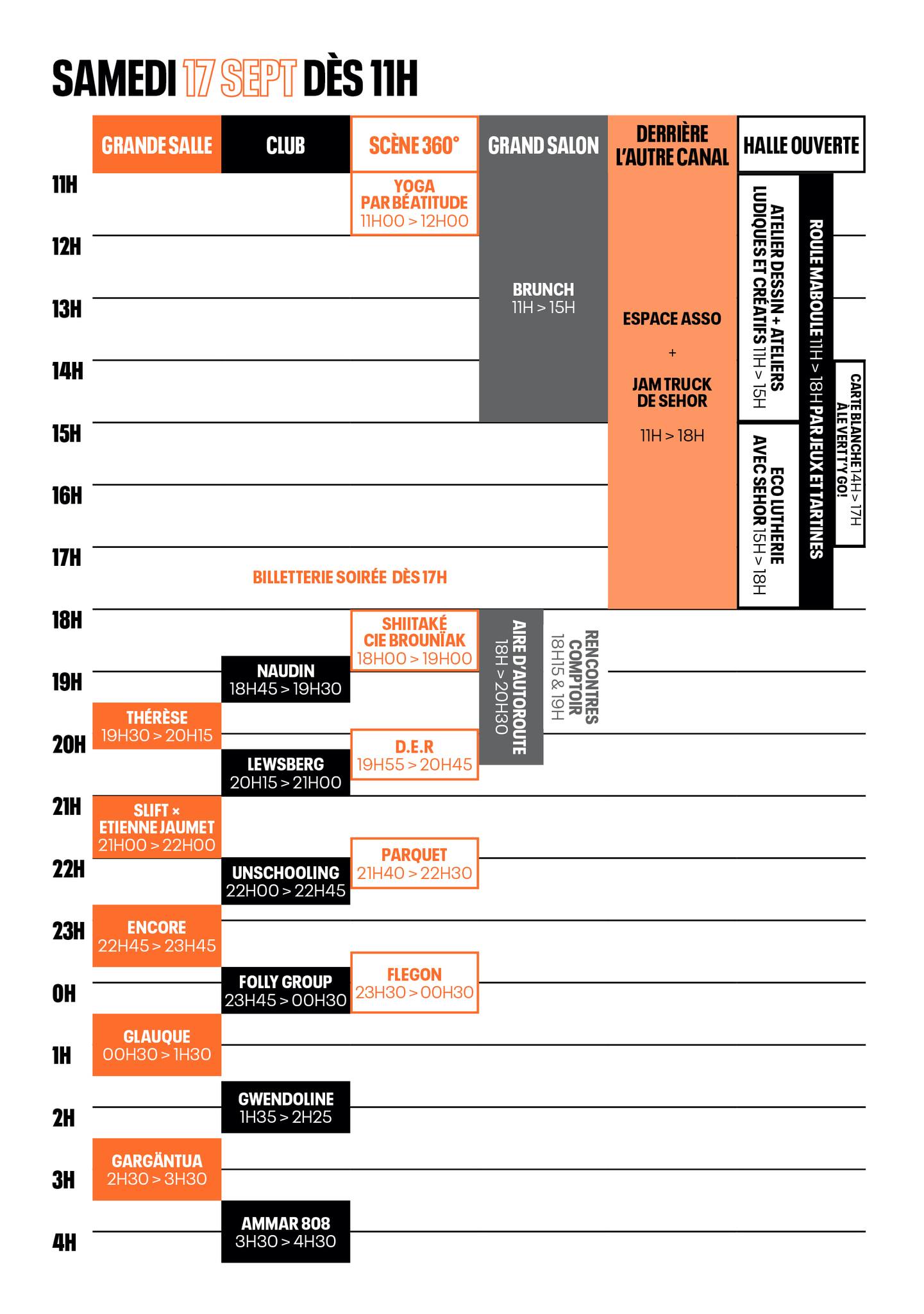 - PASS SAMEDI : 5€ (journée) / 15€ (journée + brunch midi) / 15€ (soirée) / 20€ (Journée complète + brunch)