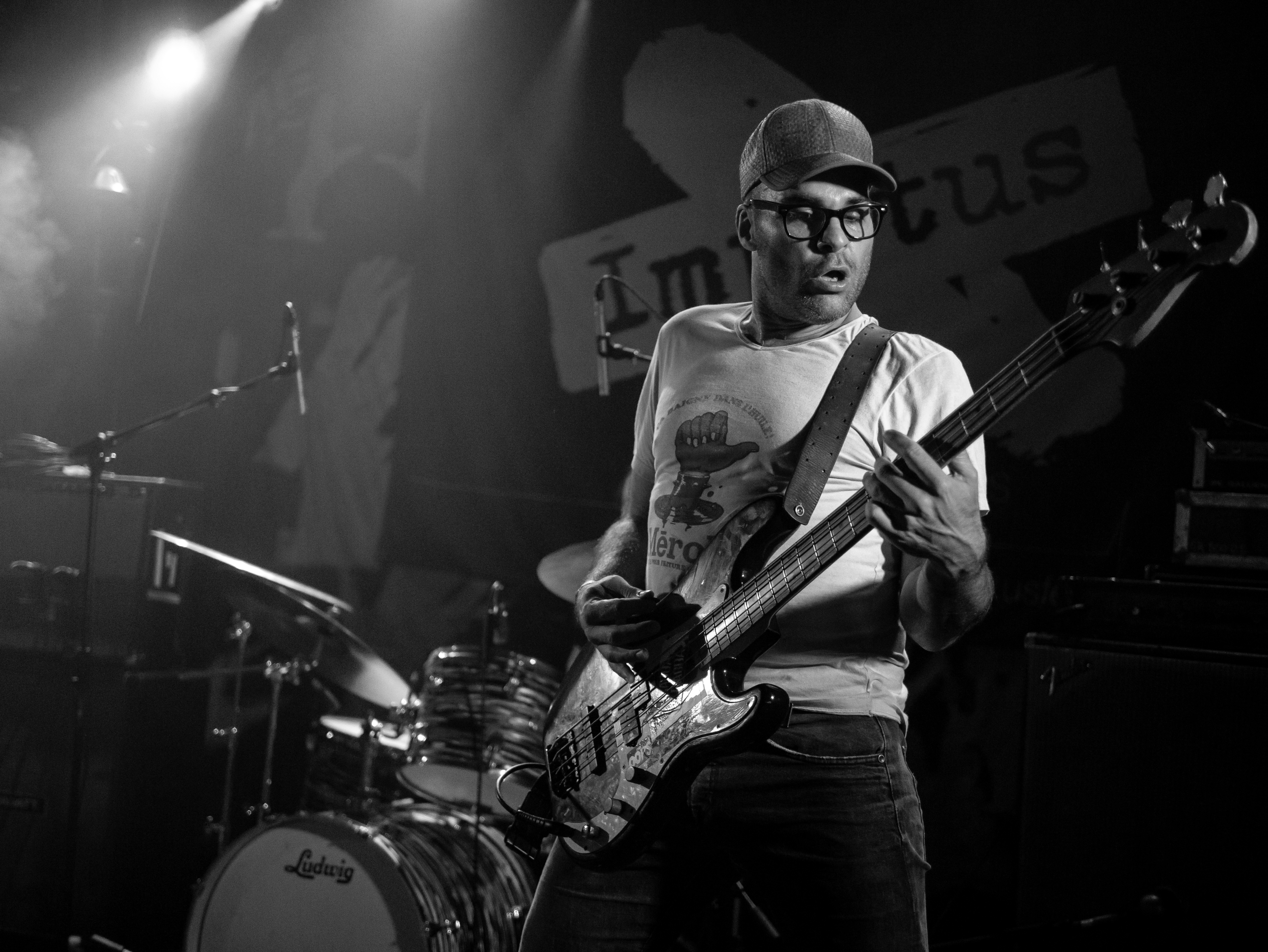 Silver Surfer de la côte d’argent Arno de Cea cumule les projets et c’est ce soir avec son trio en combinaison Clockwork Wizards qu’il déboule pieds au plancher et aux planches. Dès les premières notes on se rappelle en mémoire la prestation hyperactive des Demon Vendetta. Logique après réflexion puisque les deux groupes ont réalisé un split ensemble et surfent sur un genre de niche commun encore discret en France. Si les premiers lorgnent du côté visuel sur un mix entre scène Horror et les Suicidal Tendencies, chez les Clockwork Wizards on est plus sur de la Surf chaotique, ou comme ils l’appellent du Brutal Surf sans inspiration identitaire particulière. Nous on a décidé de breveté notre appellation en « FugaSurf » !