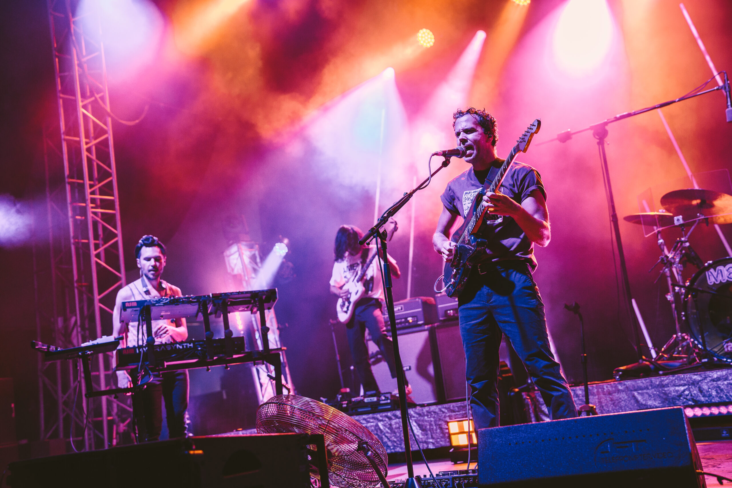 On quitte le set timide de Tamino pour se caler sous la chaude Hüttenseltz à la lueur orangée pour admirer le set des Australiens de Glass Beams. Intrigué par les masques perlés du trio, on se rapproche et la chaleur augmente.